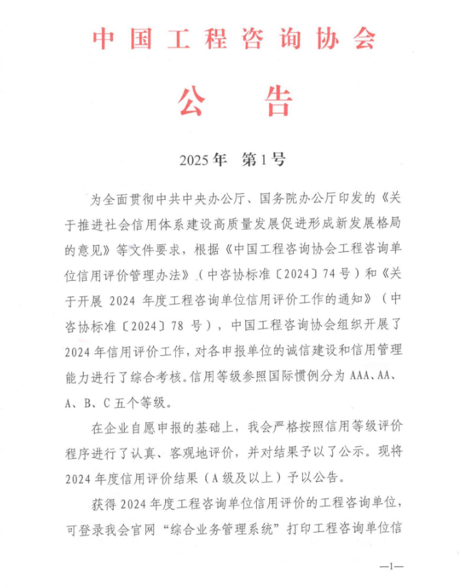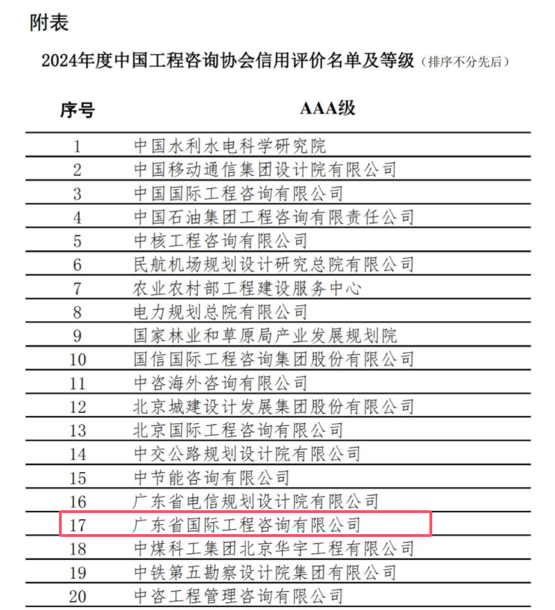 近日,中國工程咨詢協(xié)會(huì)公布了2024年度工程咨詢單位信用評(píng)價(jià)結(jié)果,廣咨國際集團(tuán)全資子公司廣東省國際工程咨詢有限公司憑借卓越的專業(yè)實(shí)力、良好的經(jīng)營(yíng)管理、突出的創(chuàng)新能力以及嚴(yán)格的信用管理,成功榮獲AAA級(jí)(最高級(jí))信用等級(jí),這是繼2024年底獲得廣東省工程咨詢協(xié)會(huì)AAAAA級(jí)(最高級(jí))信用等級(jí)后,公司在工程咨詢行業(yè)權(quán)威評(píng)價(jià)中取得的又一重大榮譽(yù)。